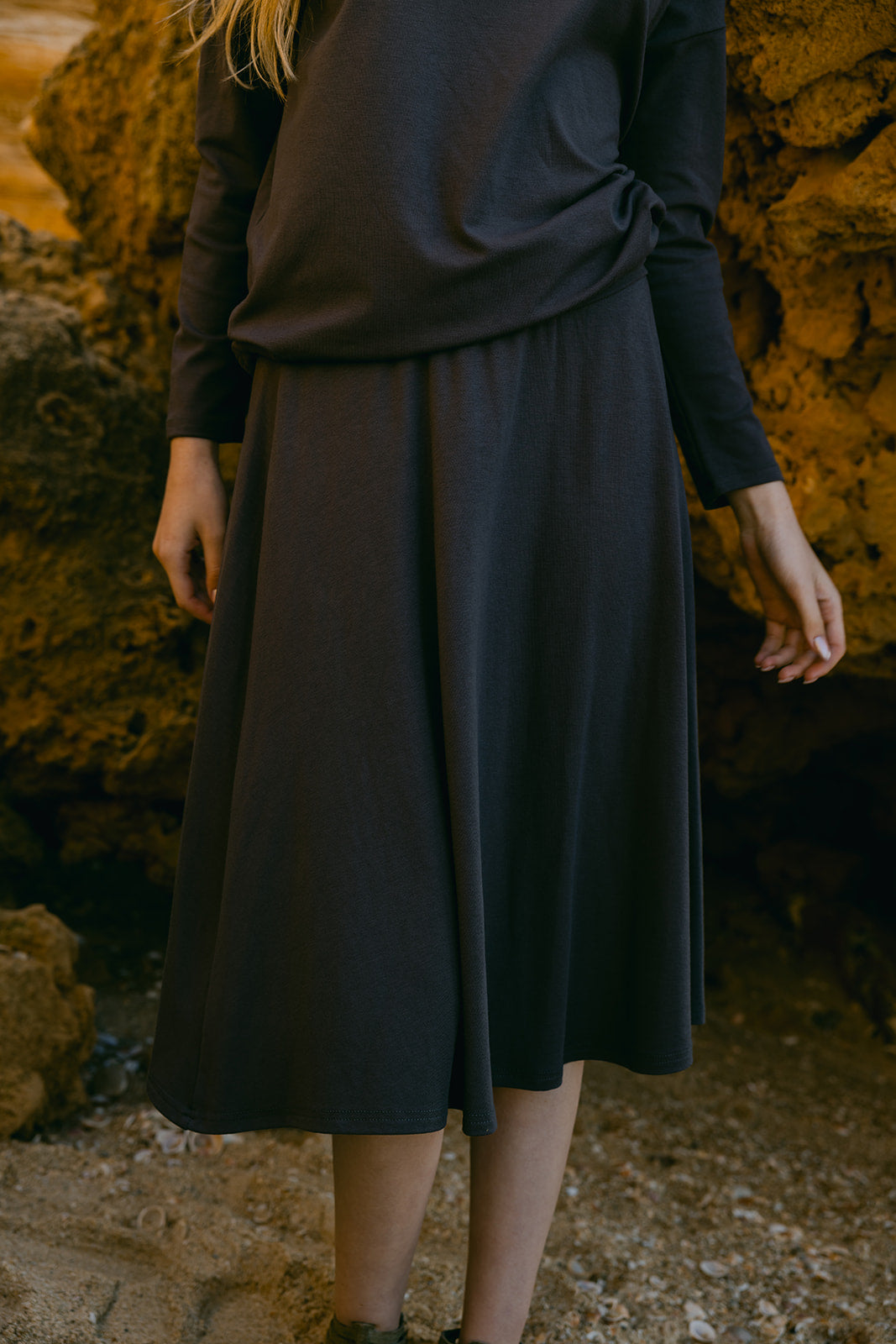 The Dalia Skirt in Raisin by Daniella Faye is a chic, modest outfit that combines elegance with comfort. Its rich raisin hue adds a vibrant touch to the flowy, sophisticated design, perfect for both casual and formal occasions. The skirt is versatile and can be styled in multiple ways, offering a timeless look with modern flair.