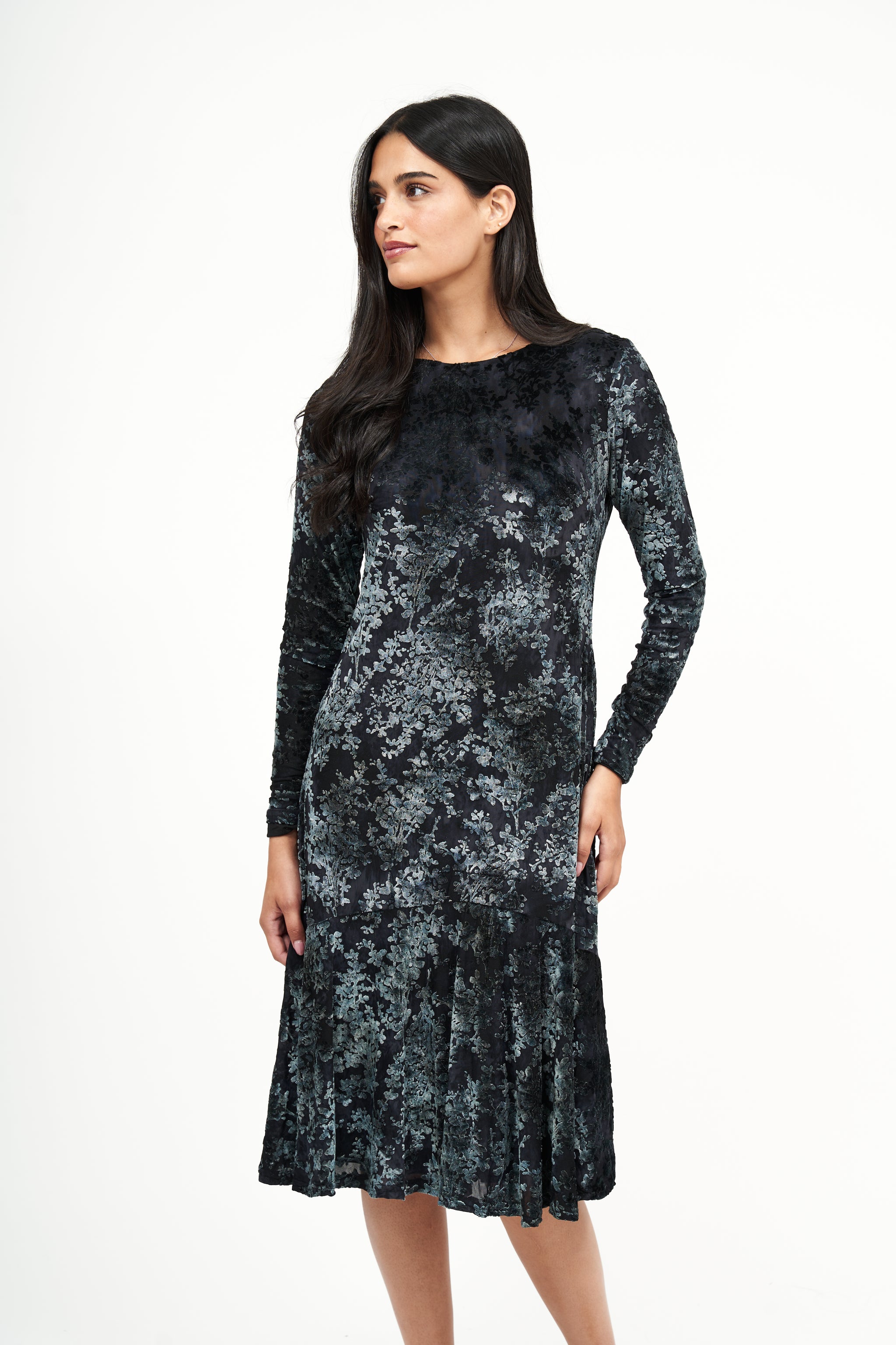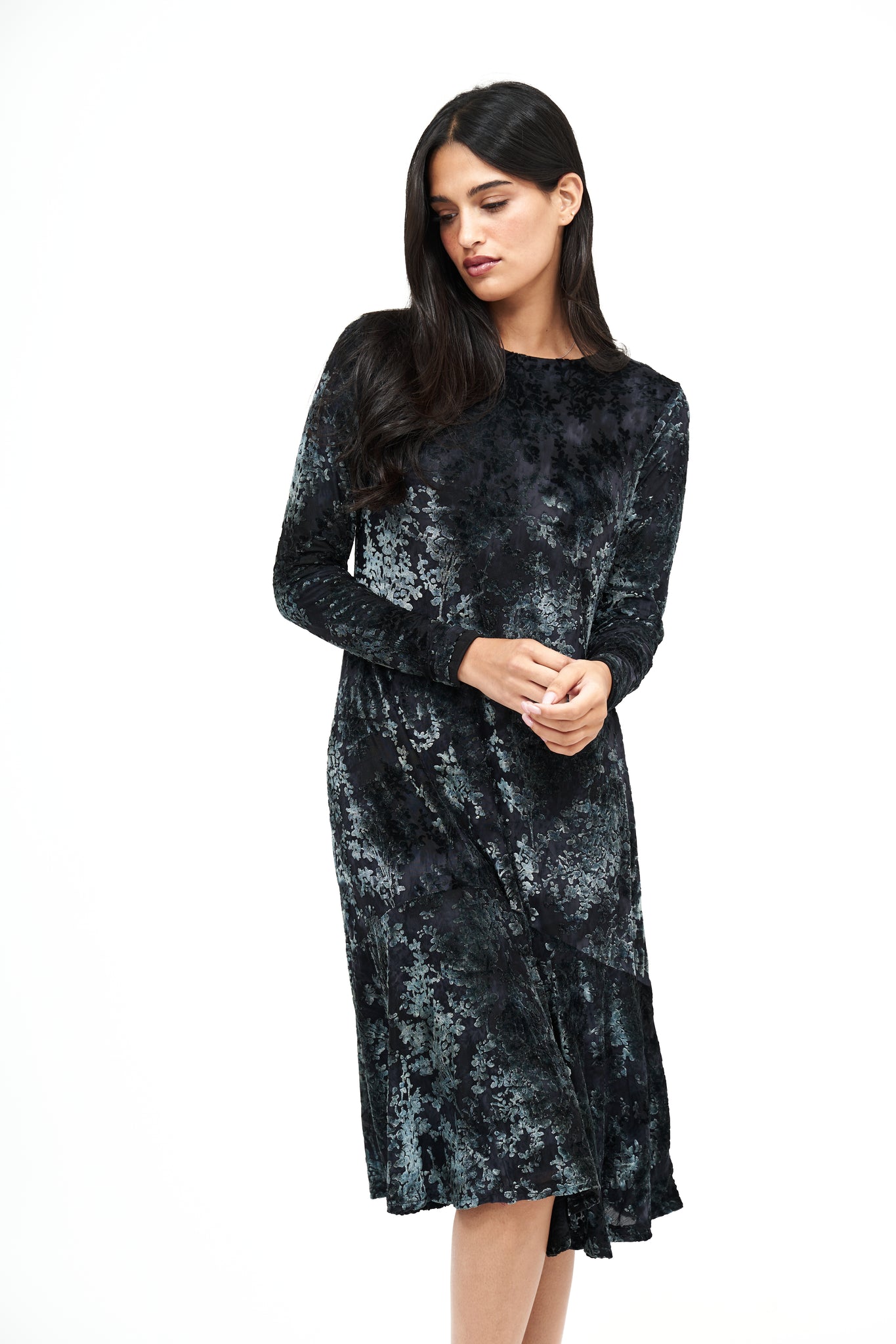 The Anthro Ruffle Crushed Velvet Dress in grey is an elegant, knee-length garment featuring a luxurious crushed velvet texture. This chic dress is adorned with delicate ruffle detailing, making it perfect for both sophisticated evenings out and stylish daytime events.