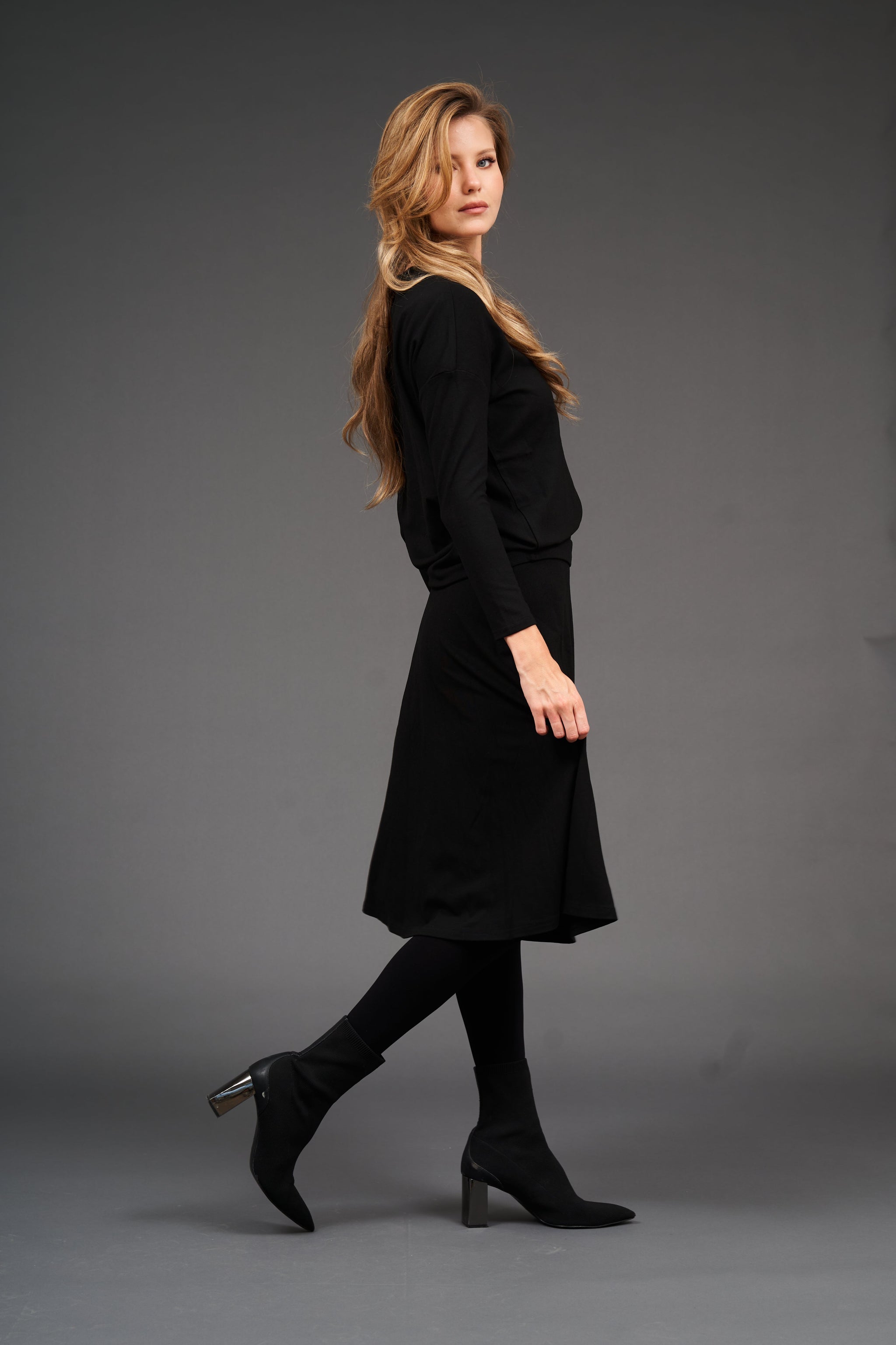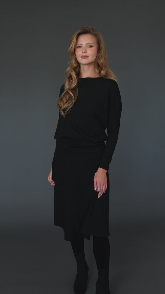 A graceful flow in timeless black. Light enough to move with you, yet cozy enough for cooler days, it's the kind of skirt that feels right for any occasion.
