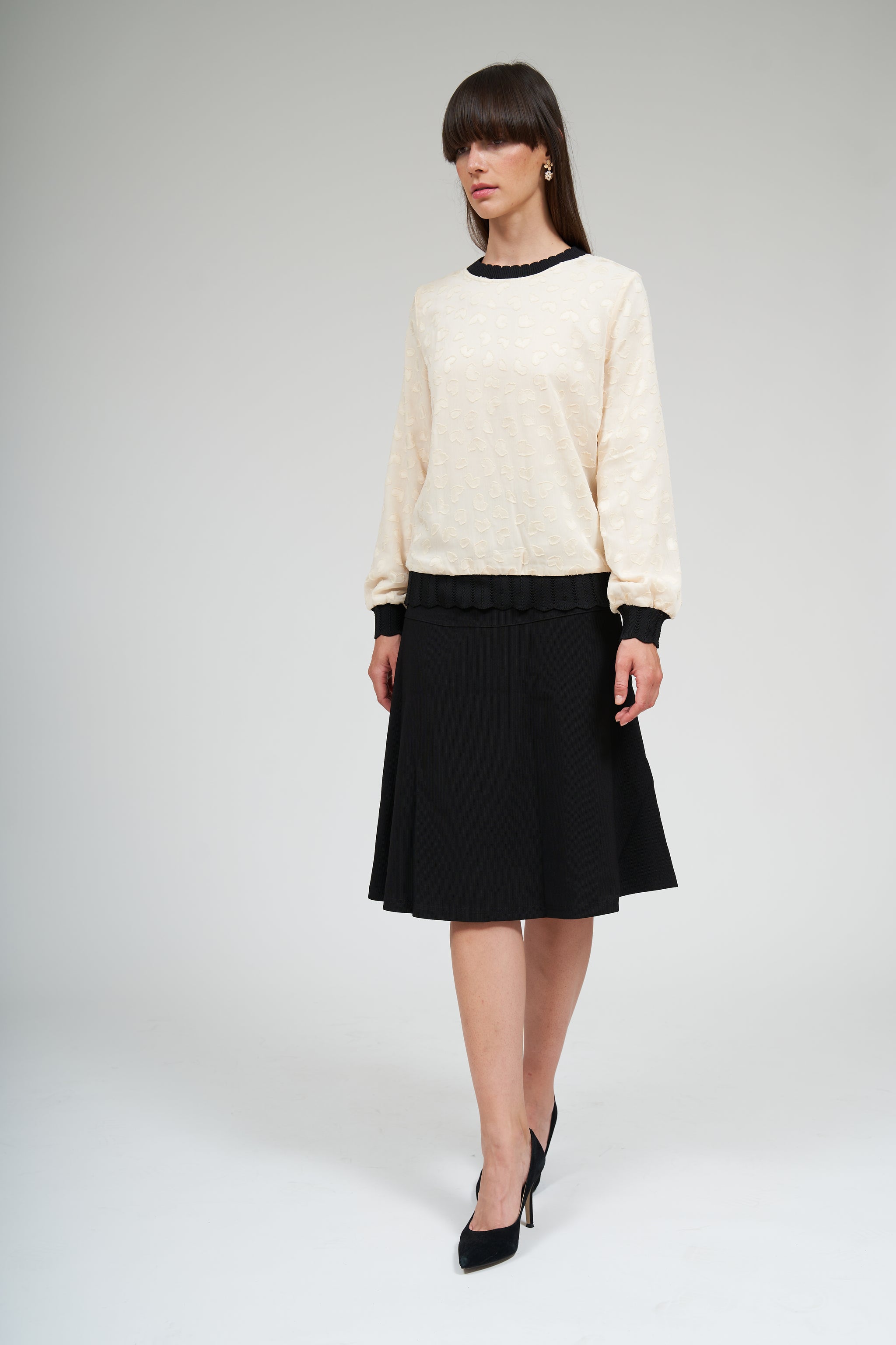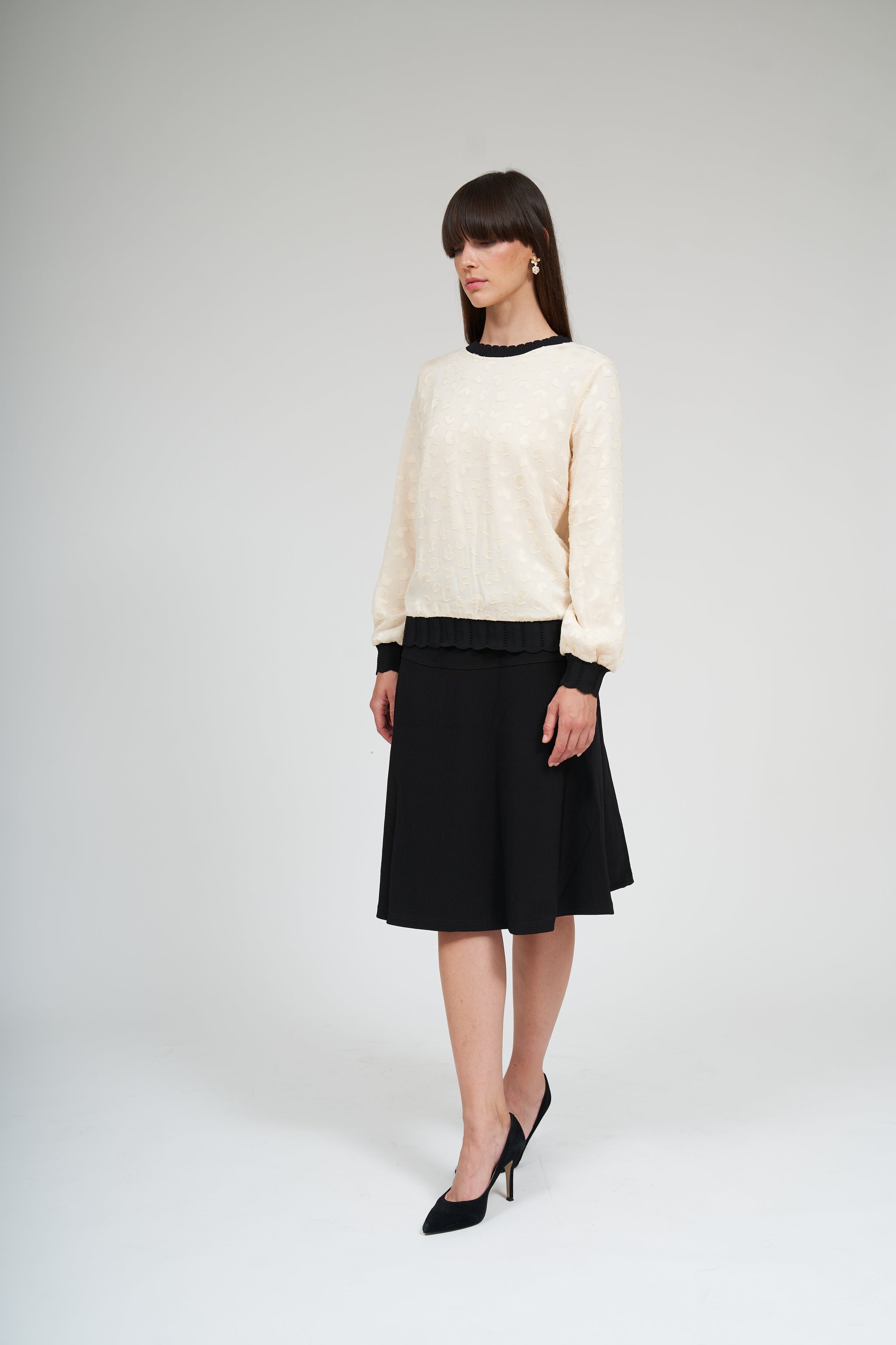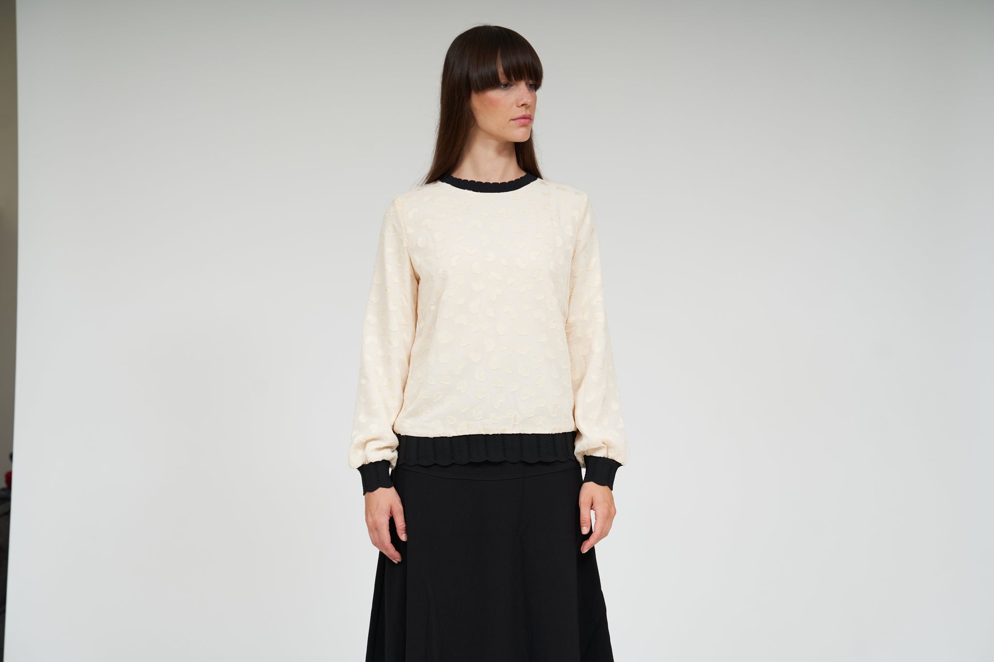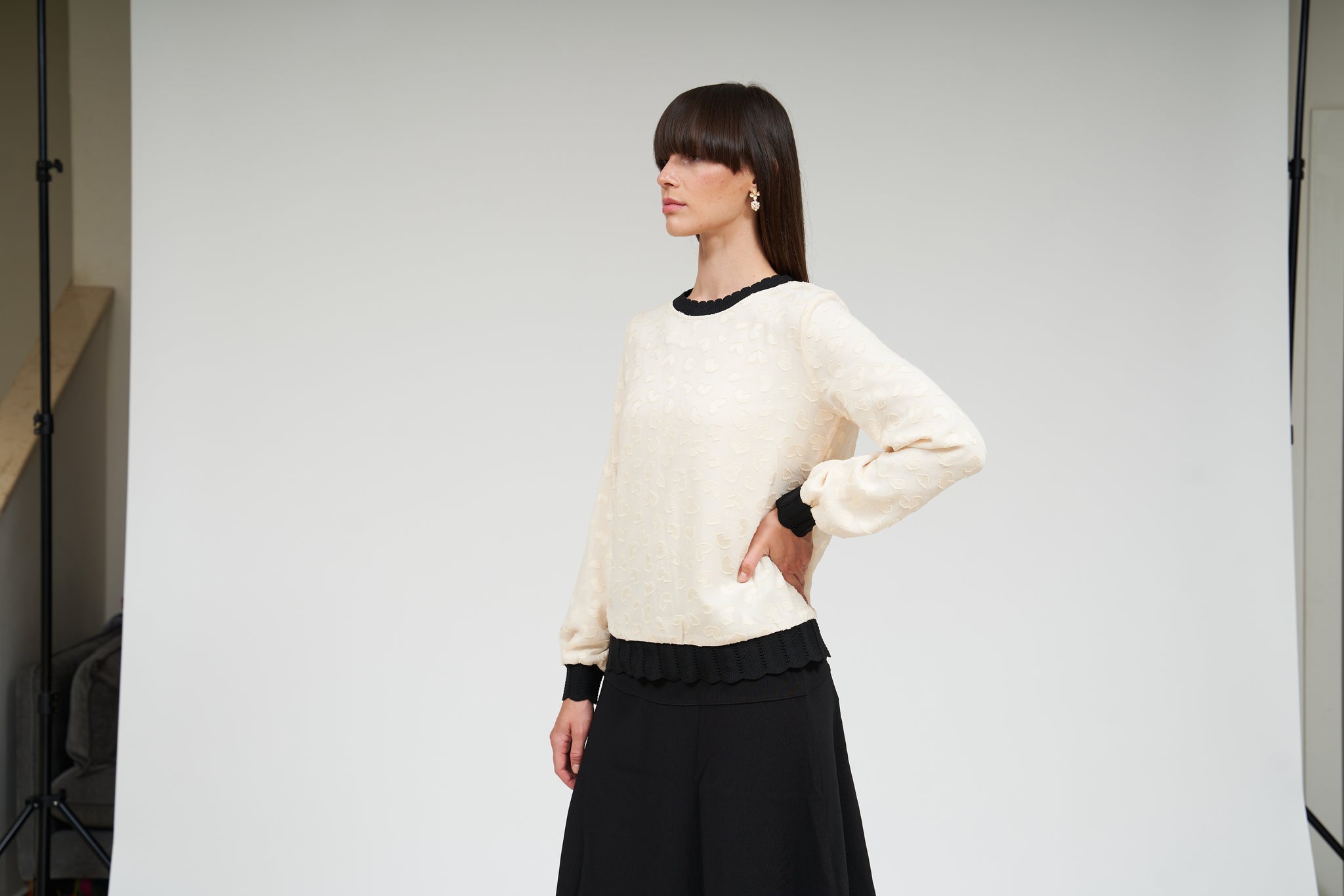The Reese top is a stunning blend of elegance and sophistication, featuring a soft white fabric base that feels great against the skin. The black crew neck and cuffs add a touch of modern flair, contrasting beautifully with the white backdrop. The real showstopper is the exquisite embellishment, adding a touch of glamour and making this top a statement piece for any black, white and or jean skirt.