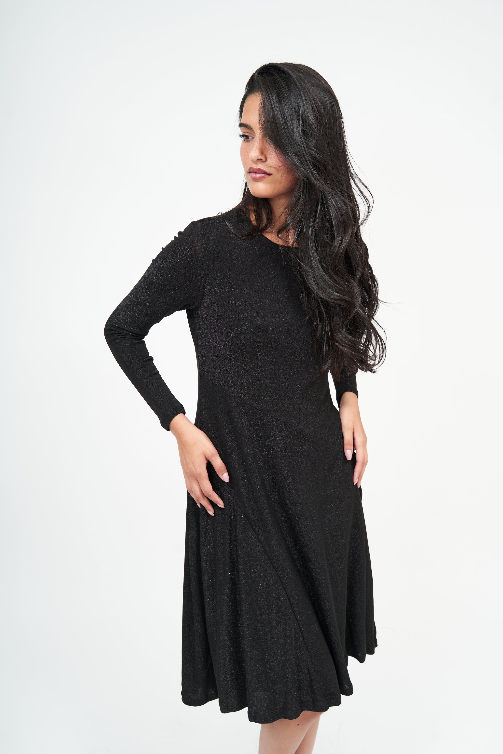 The New Slant Short Sparkle Dress in black is a chic, knee-length dress adorned with subtle sparkles that add a touch of glamour. Featuring a unique slant cut, this dress effortlessly combines elegance with a modern twist, perfect for special occasions.