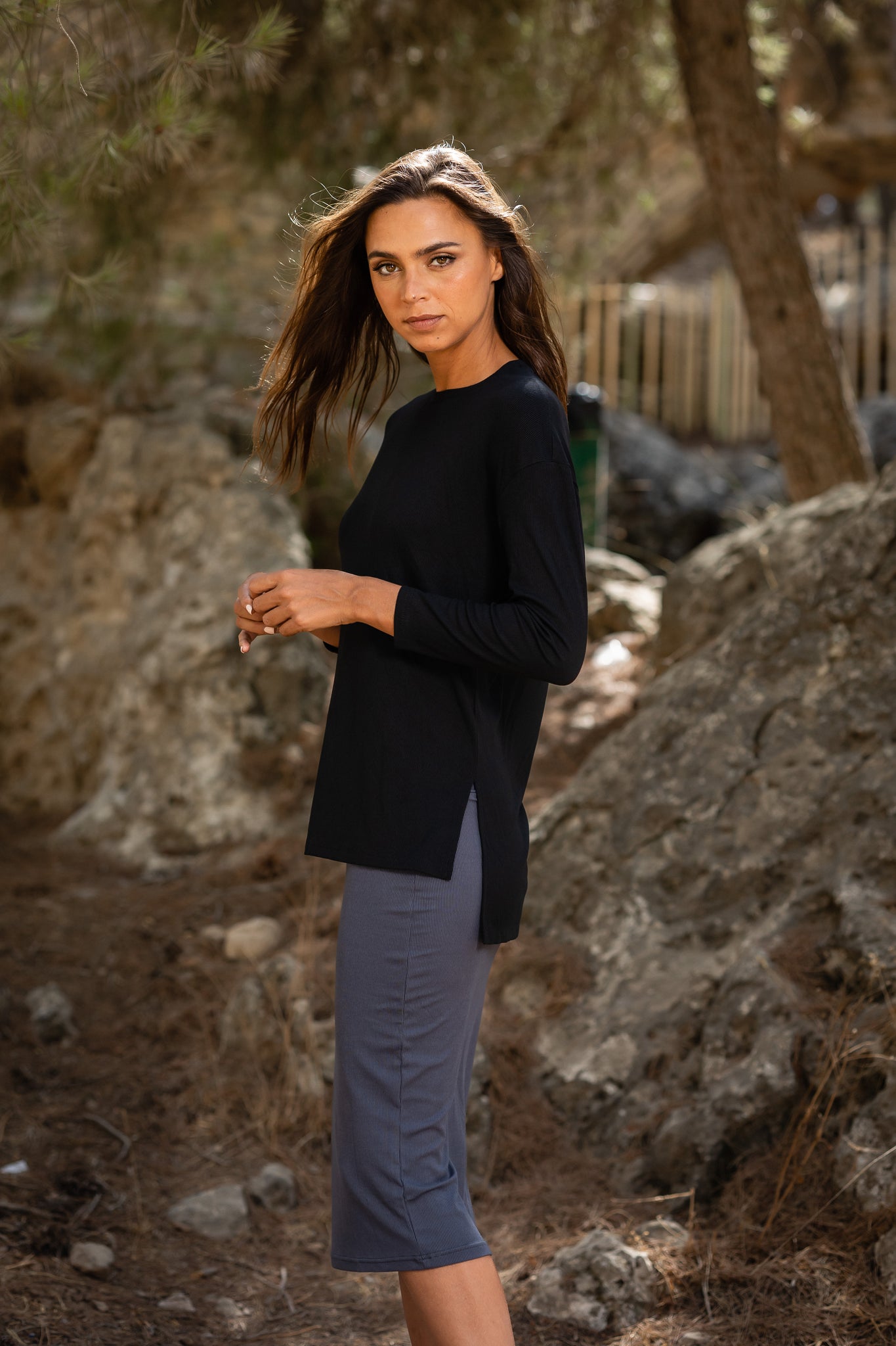 Our Original Top has been a best-seller for years! This top has a flattering cut with dolman sleeves, high-low hem, and side slits. You will reach for this top again and again! Pair it with our Ribbed Pencil Skirt for the perfect set!