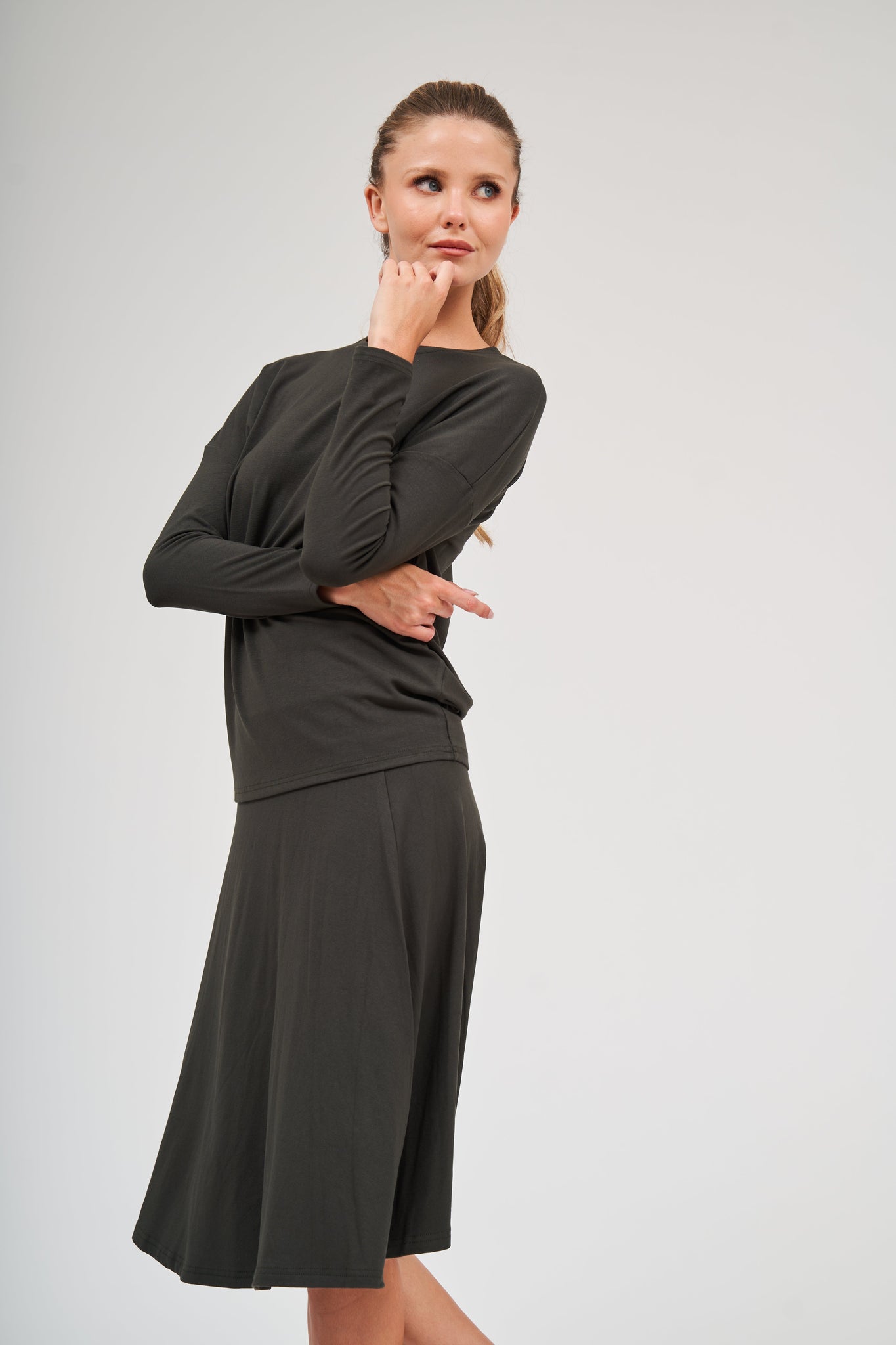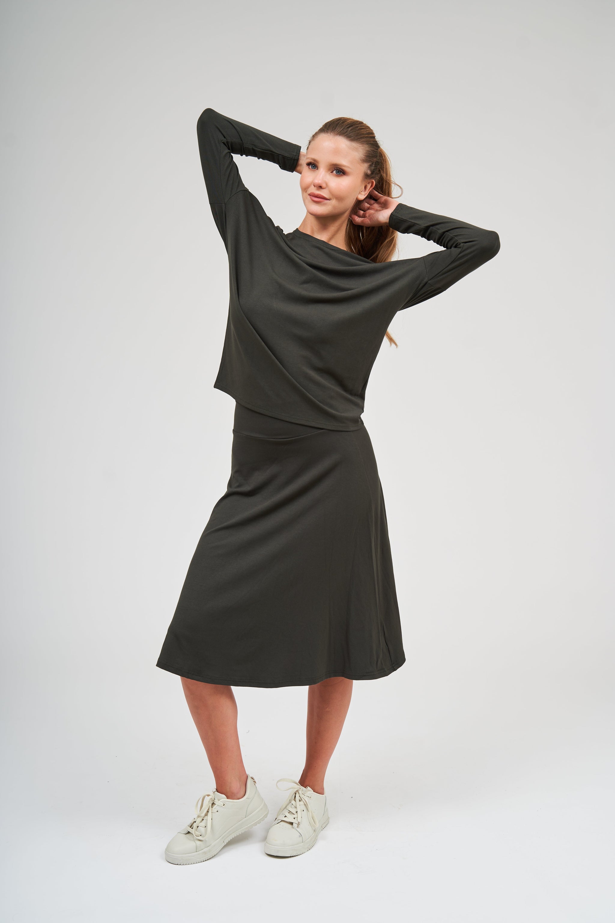 Deep green with an earthy richness. This skirt's easy movement and flattering shape make it perfect for autumn strolls or evenings in.