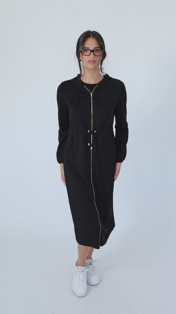 The NW Hoodie Dress in black is a cozy, knee-length dress featuring a relaxed fit and a practical hood. Its casual yet stylish design makes it perfect for laid-back outings and everyday wear.
