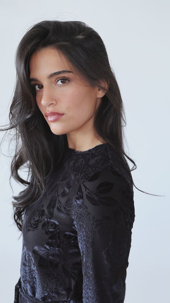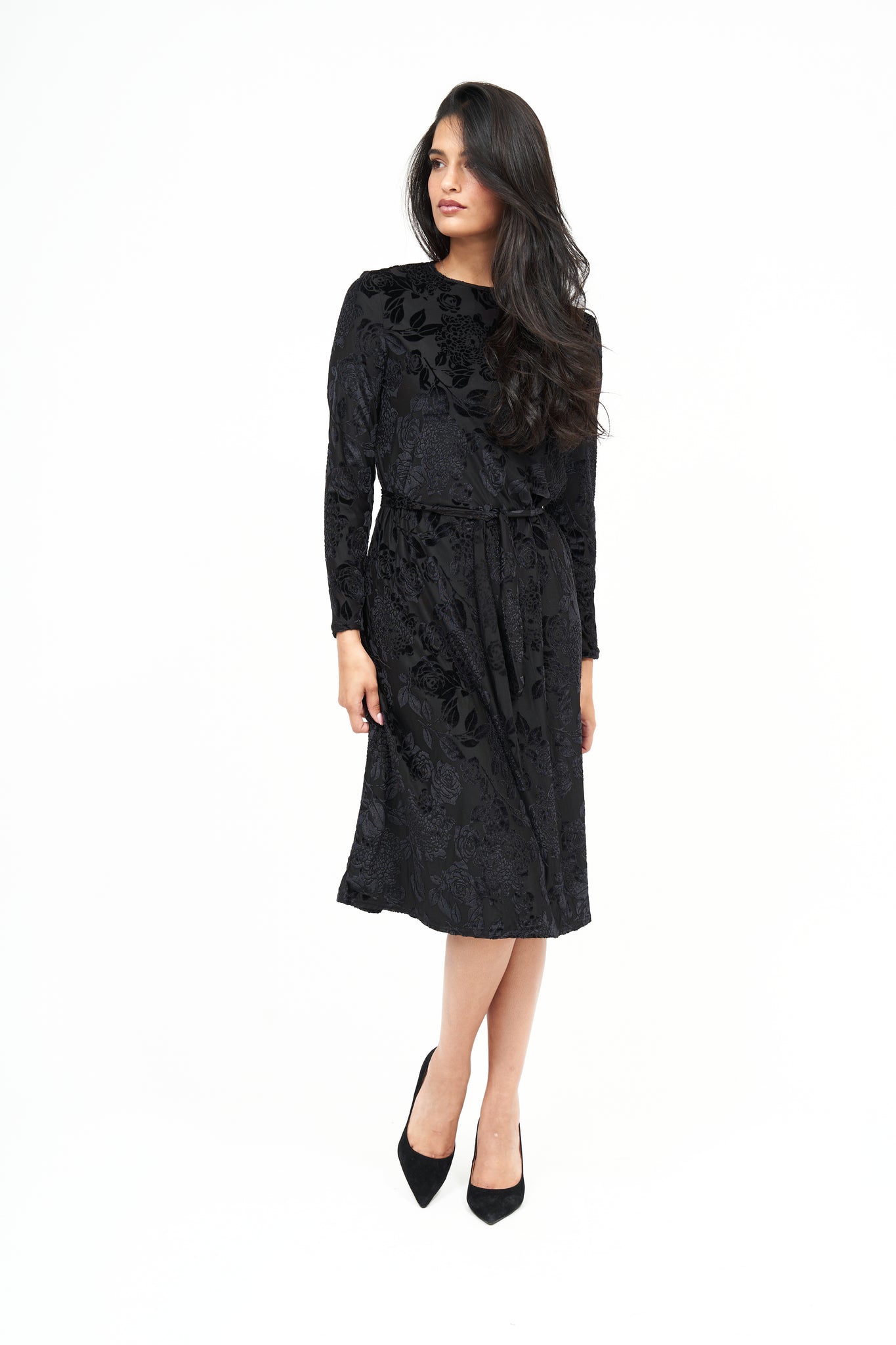 The New Swing Floral Velvet Dress in black is a stylish, knee-length dress featuring a beautiful floral pattern on soft velvet fabric. Its swing silhouette offers a flattering, comfortable fit, making it perfect for both casual outings and dressier occasions.