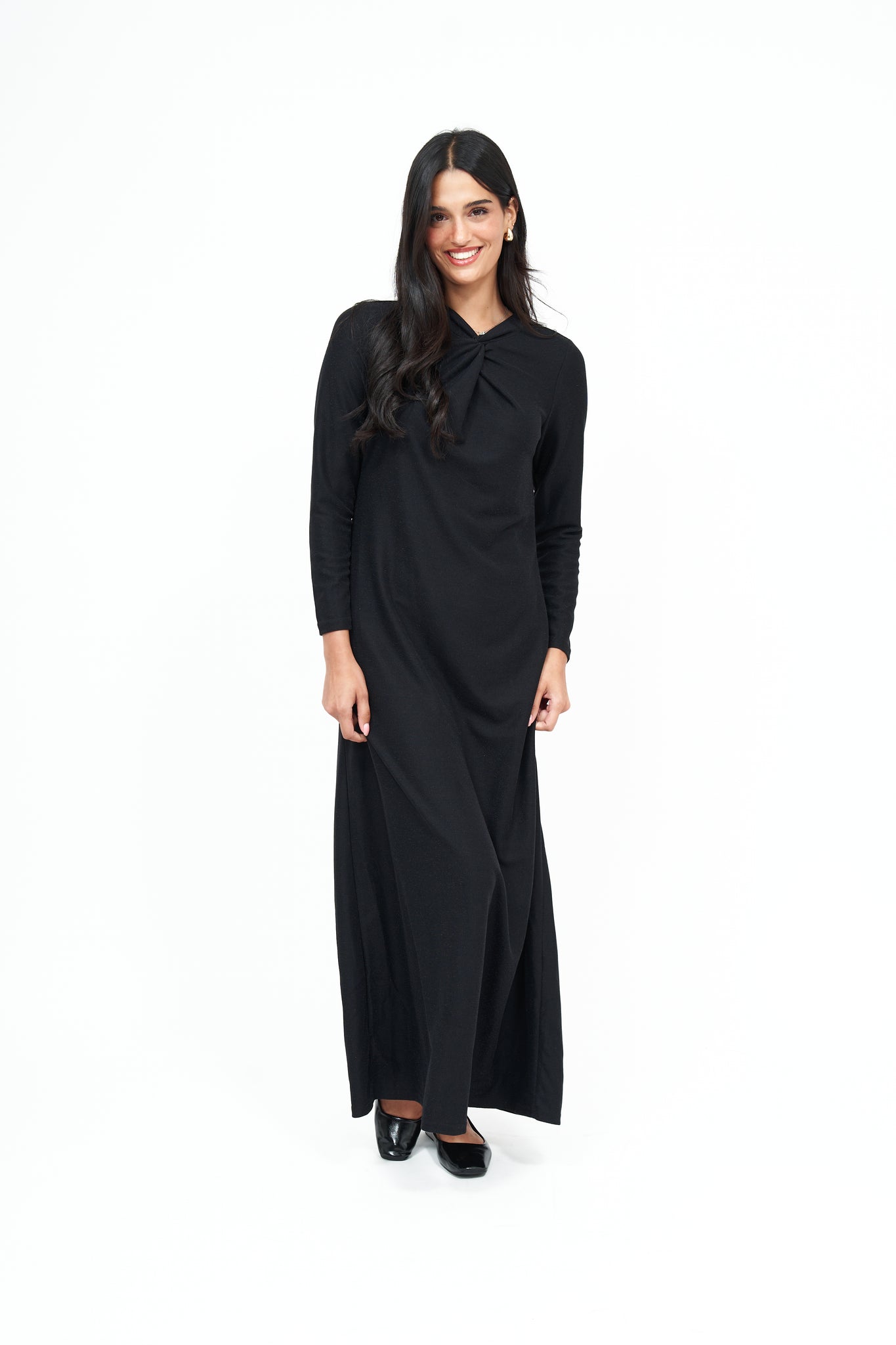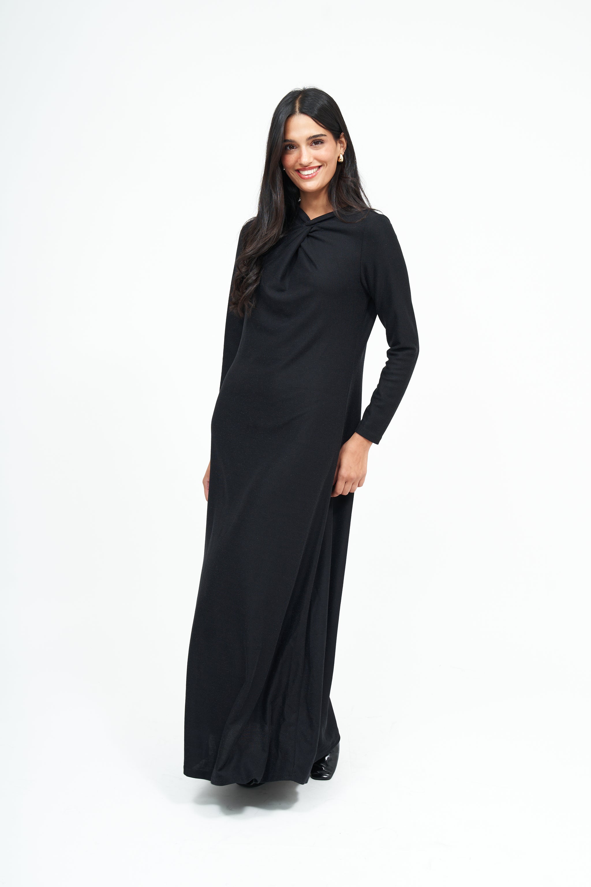 The Maxi Twist Shimmer Dress in black is a stunning floor-length gown that exudes elegance with its shimmering fabric. Featuring a unique twist detail at the neck line, this dress is perfect for making a glamorous statement at any formal event.