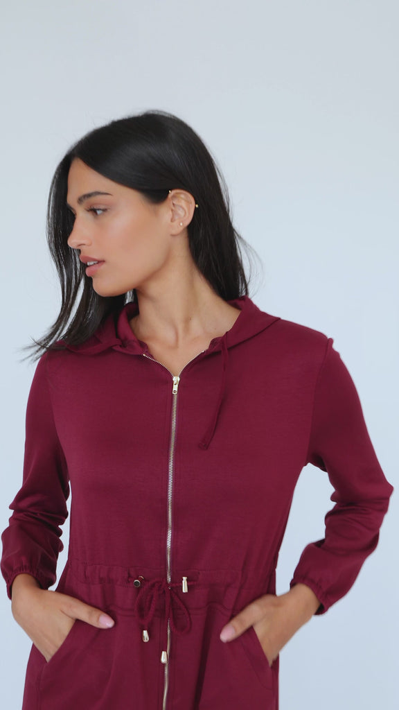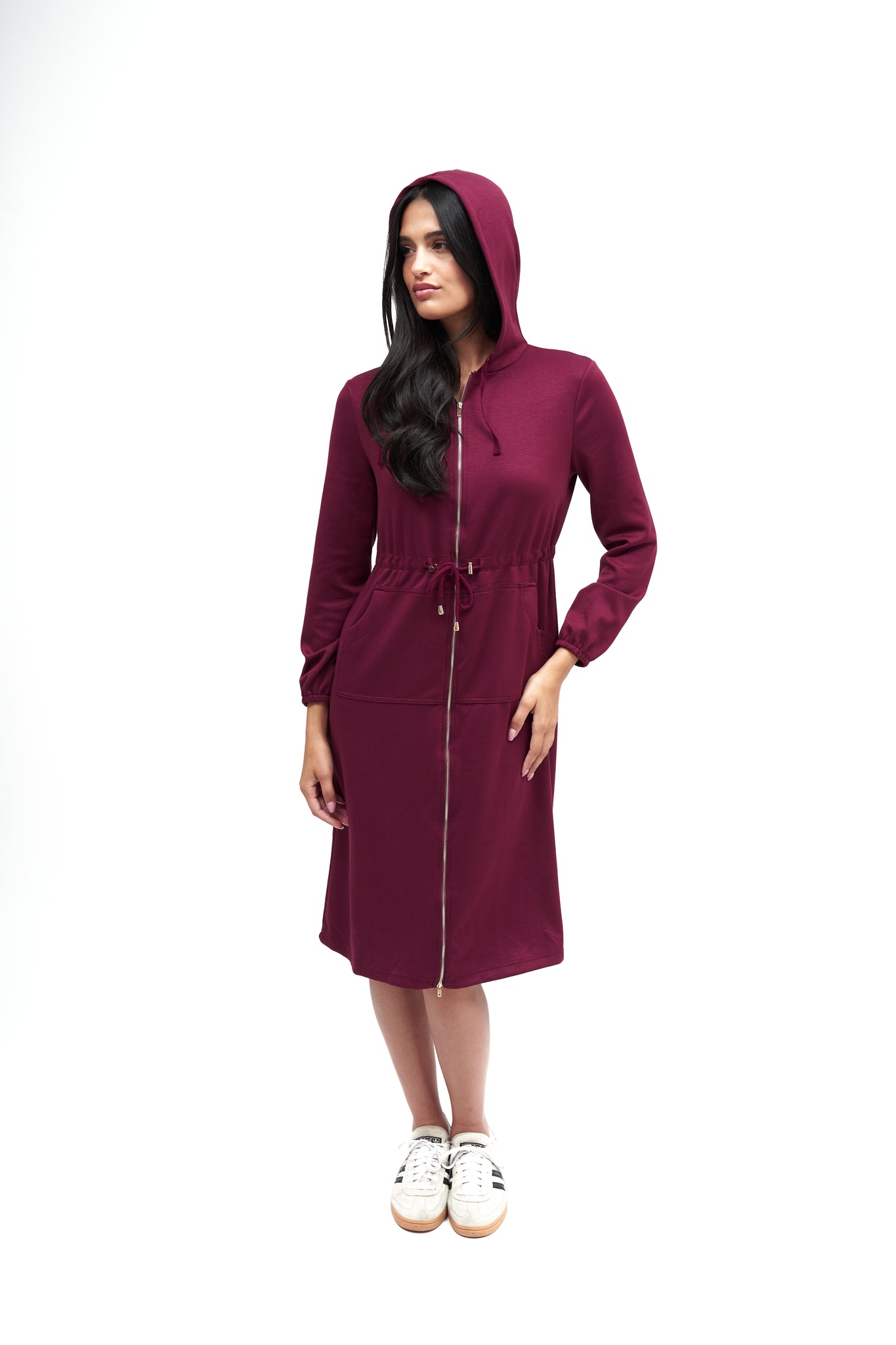 The NW Hoodie Dress in maroon is a cozy, knee-length dress featuring a relaxed fit and a practical hood. Its casual yet stylish design makes it perfect for laid-back outings and everyday wear.
