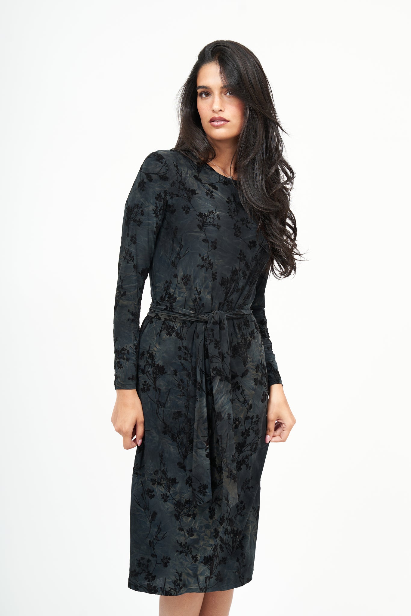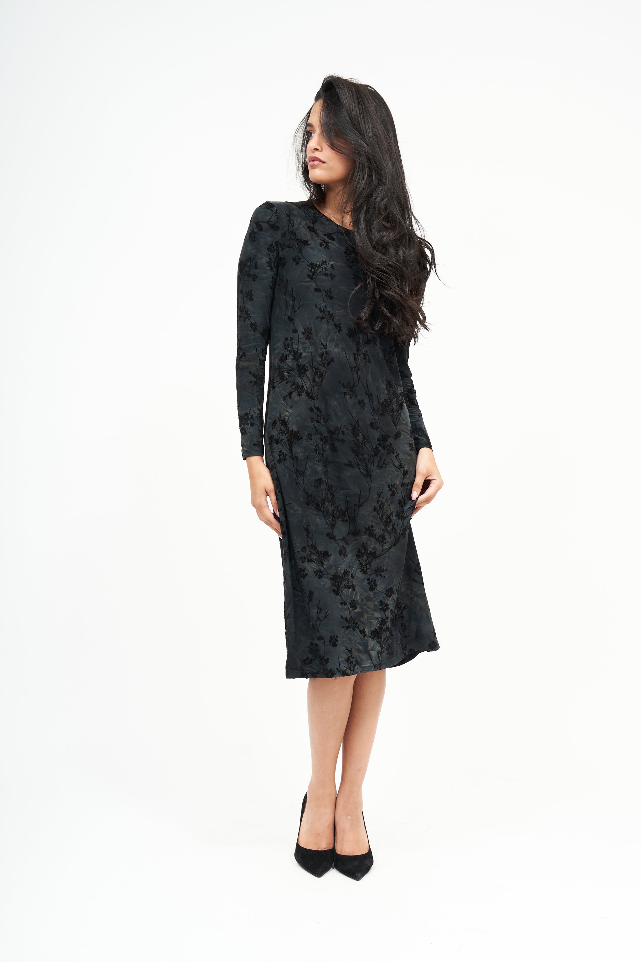 The Loose Basic Floral Velvet Dress in black and grey is a comfortable, flowy piece adorned with a subtle floral pattern. This versatile dress combines the soft texture of velvet with a relaxed fit, making it ideal for both casual and semi-formal occasions.