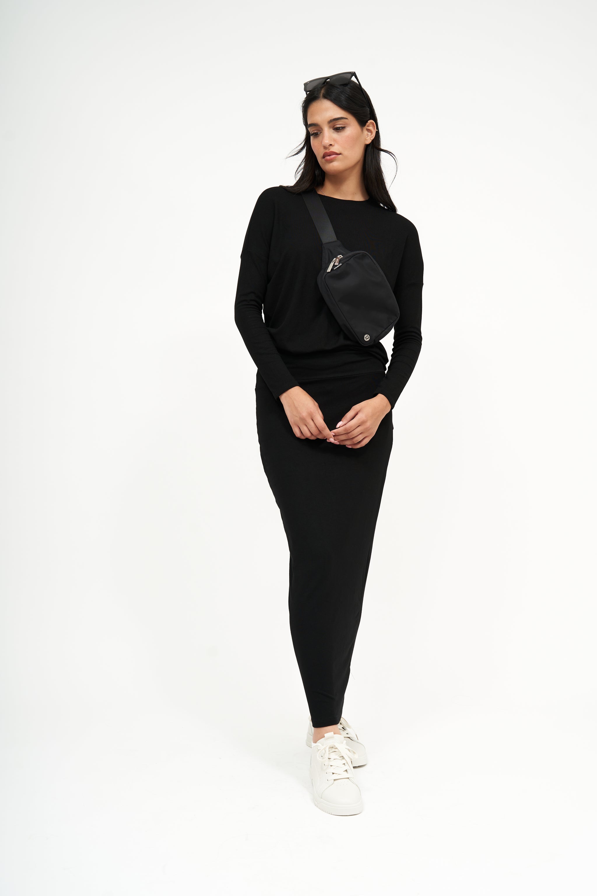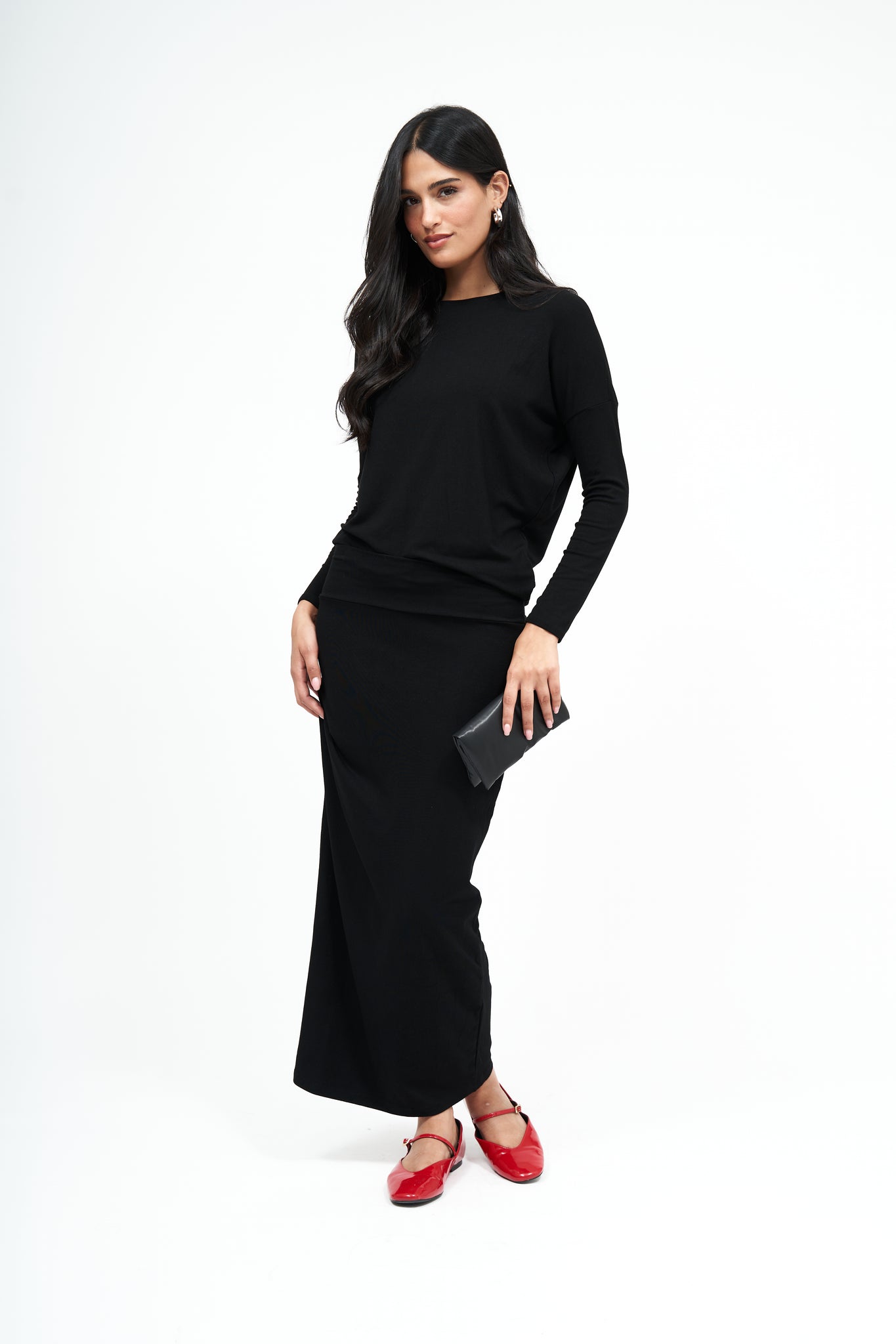 The New Maxi Pencil Skirt in black is a sleek, form-fitting piece that elegantly elongates the silhouette. Its timeless design and versatile length make it a perfect choice for both professional and casual settings.