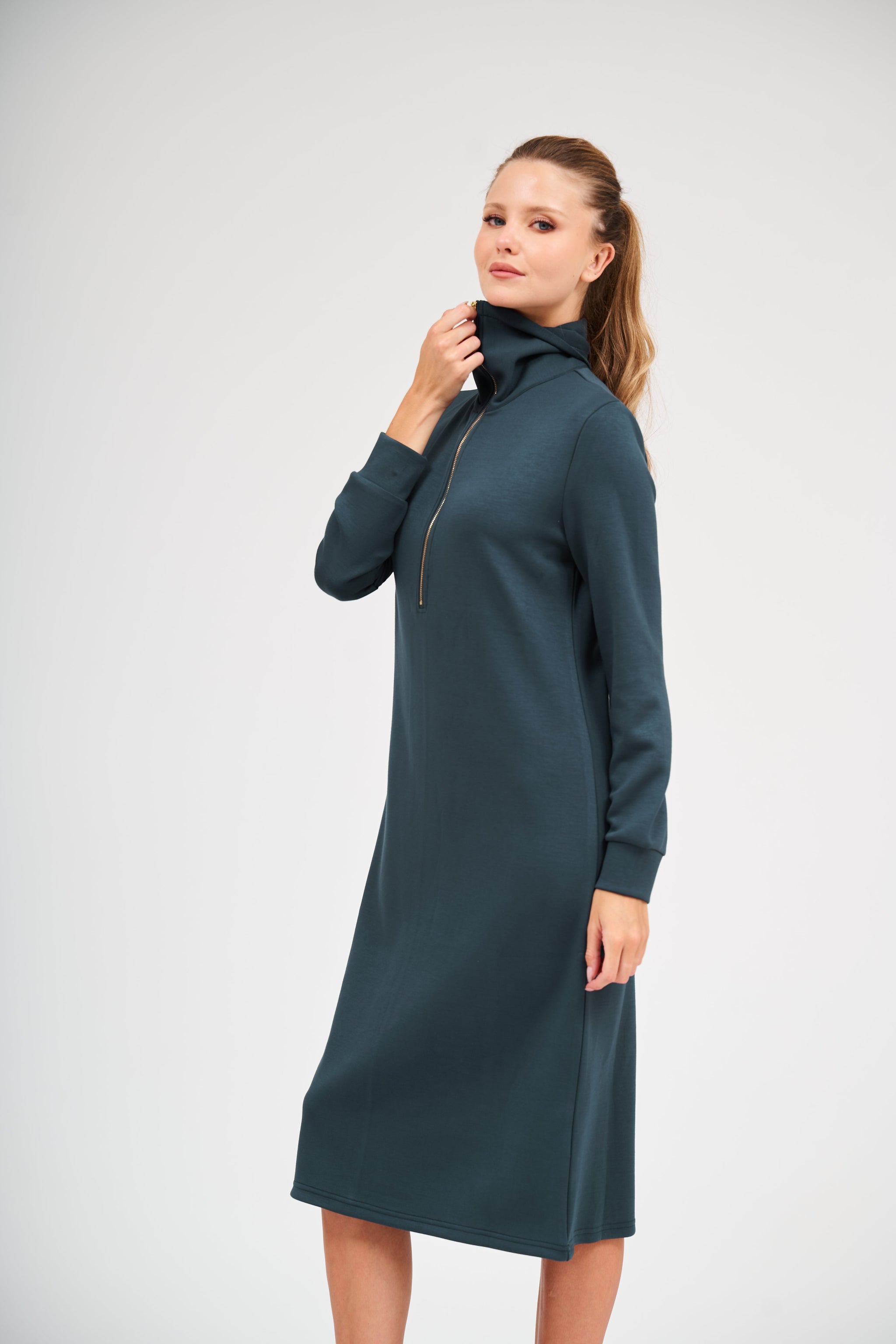 A flattering teal dress with a flowy, easy silhouette. Lightweight enough for indoor wear, cozy enough for cooler evenings - a go-to for simple elegance.