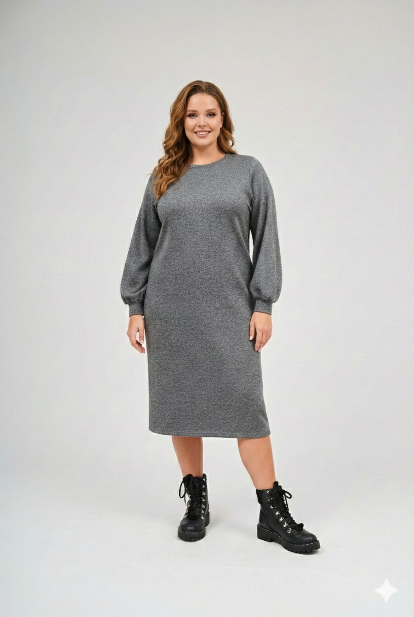 A cozy heather grey dress with softly gathered sleeves for a touch of charm. Warm yet lightweight, it's perfect for layering through autumn and winter.